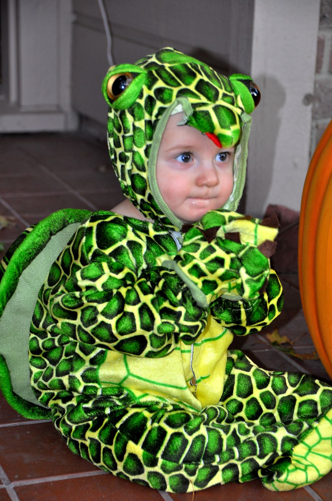 A favorite Halloween memory is spreading out after gathering all of our loot and setting up a candy shop with my brother. We would buy, sell, and trade treats for hours until we were satisfied with the perfect mix. Mom always came up with the cutest costumes and having an artist in the family means your cat face almost looks real! I have been a cat, Pippie Longstocking, a mime, a cheerleader, raggedy Ann, and the list goes on. I had to come up with the perfect costume for Liam. I knew that I wanted something in his favorite color, green, but all of the costumes were either incredibly hot or ridiculously expensive for an infant who would most likely be in the costume for less than 15 minutes. I am a little alligator crazy and I searched high and low, but settled on this adorable little turtle.